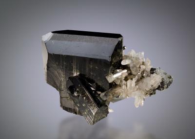 A 3.8 cm wide, twinned epidote crystal featuring a great termination, another doubly-terminated smaller crystal hanging on the lower front and a nest of quartz crystals attached on the right side make this a very fine and well-balanced miniature! No damage.