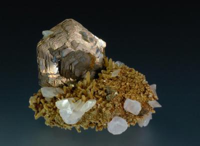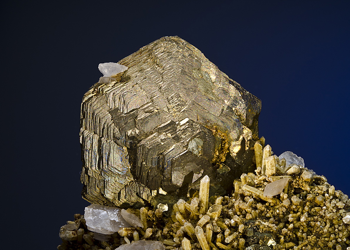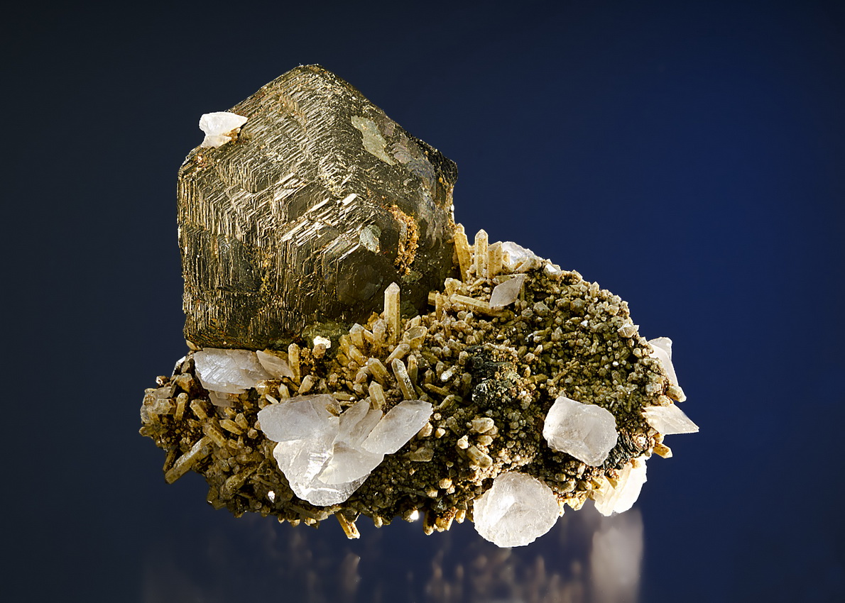 A well crystallized matrix of needle quartz and white calcites is host to a 4.6 cm wide pyrrhotite crystal. The piece is a full floater and undamaged all around! Great aesthetics and visual impact!