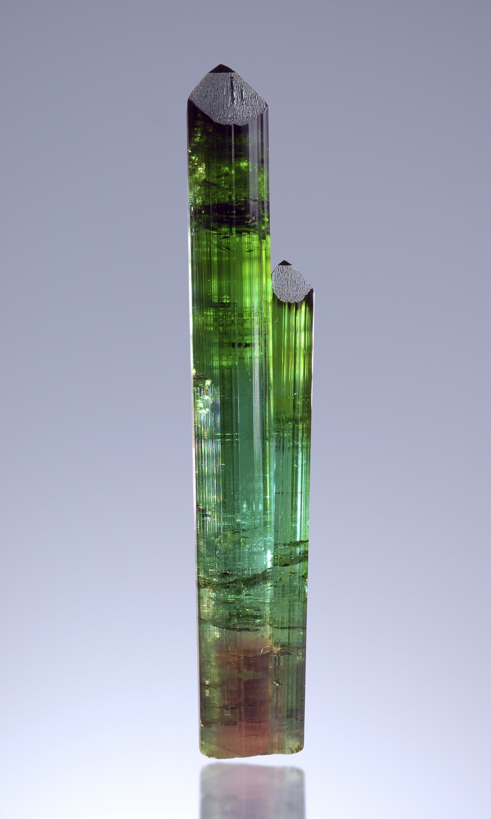 Very fine gruop of two multicolour tourmaline crystals in paralel growth. The piece comes from the famous "rocket pocket" and features very typical colours and pristine terminations. One clean repair.