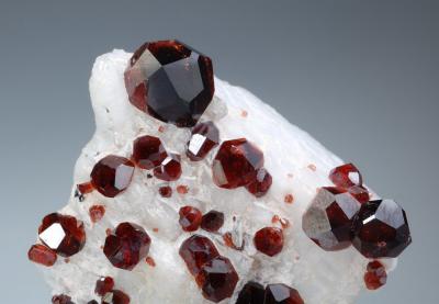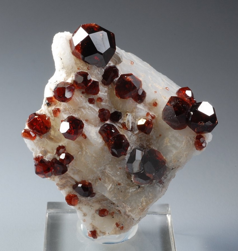 Two dozen spessartine crystals of various sizes are scattered on a white feldspar crystal! The garnets are fiercely red, highly lustrous and especially the smaller ones are fully transparent throughout. All crystals are in perfect condition.