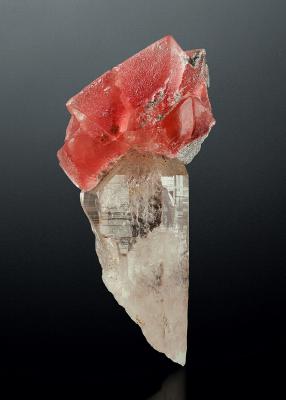 What a killer specimen from the Swiss Alps! Several pink fluorites in a cluster are perched atop a clear quartz crystal! The fluorites have a very pleasing and intense pink colour and very good transparency! The quartz crystal is fully crystallized at the bottom side, too. The piece is in fact a floater and totally pristine all around! No damage and no repair!