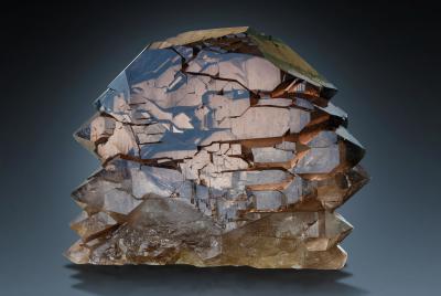 This is a huge and very impressive gwindel specimen. It features 6-7 doubly terminated individual smoky quartz crystals stacked together and forming this wonderful gwindel crystal. Small chipping is present along the sides, but it is in fact small in context. The colour and gemminess are incredibly fine and make this a centerpiece for every alpine collection. Great quality and visual impact!