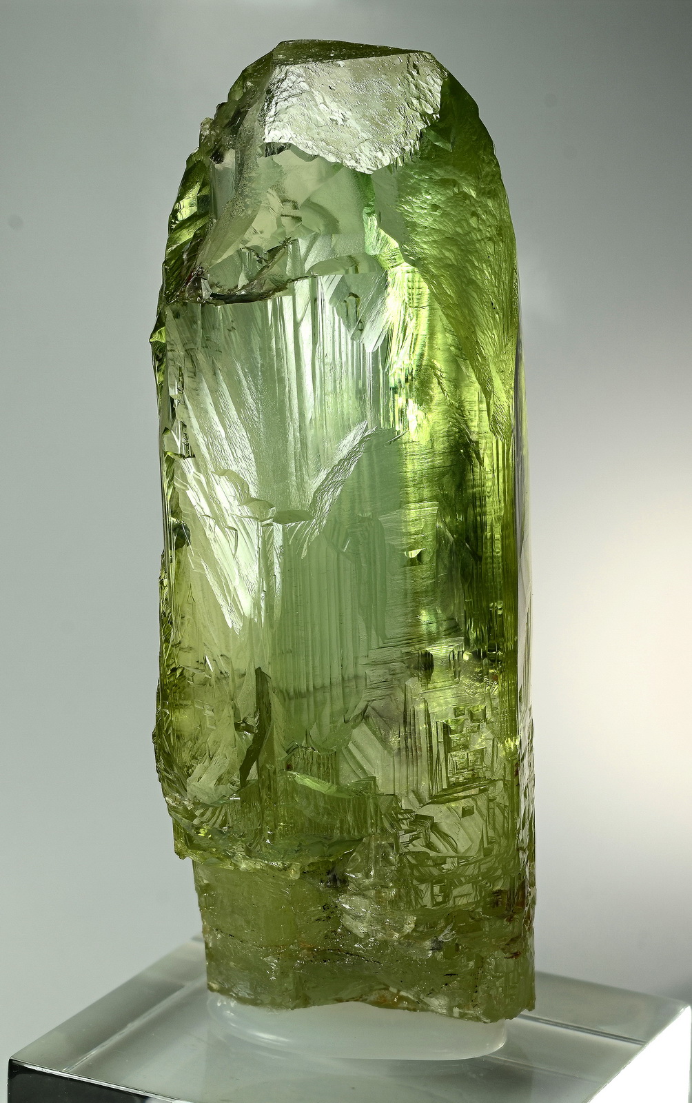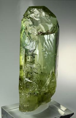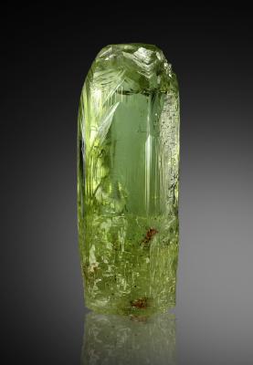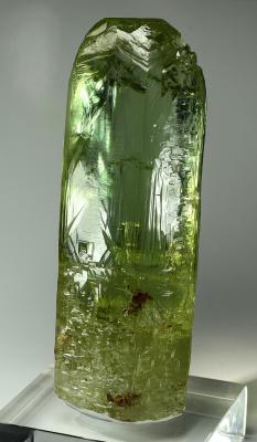 WOW!!! What a superb cabinet sized heliodor crystal! It features fantastic shape combined with super glossy luster, beautiful greenish-yellow colour, amazing clarity, bevelled termination faces, slightly rounded (but still well visible) edges and fantastic non-etched sides altering with wonderful etching patterns! Furthermore, it is doubly terminated and the only large crystal of this particular colour and style ever found! This crystal was found in Pegmatite No.576 in 2003. The weight is 347 grams. Zero damage on any side. What an outstanding and jaw-dropping gem crystal! Price on request.