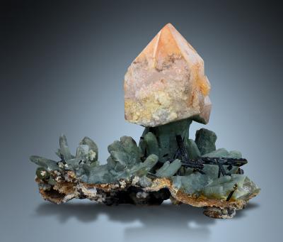 Wow, what an amazing quartz sceptre on a prase stem! Only one pocket of this special material has ever been found at the locality, and this specimen is indeed one of the top 5 pieces! A large and fat main sceptre crystal stands upright on a plate of matrix, made of smaller prase quartz crystals. Ilvaite needles set a beautuful contrast. The scepter is pristine and in perfect condition on all sides. A gorgeous addition to every advanced quartz collection!