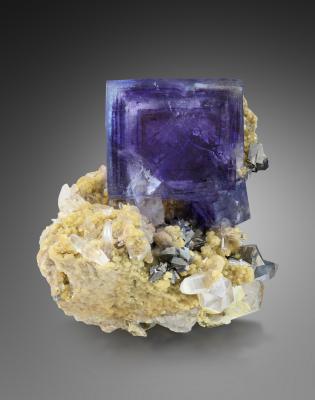 What a major classic alpine specimen! This piece comes from the Gotthardtunnel, dug in the 1970s of last century. A composite cluster of large fluorite octahedrons to 5.0 cm across is resting on a floater matrix of chlorite included fluorites. Associated minerals are quartz (on back side) and a fine cluster of green apophyllites perched on top right side. The entire specimen is actually a complete floater and has no points of attachment or contact. the colour of the fluorites is quite unusual and more on the yellowish/orange side than one would expect from a swiss locality. Note how well the back side is crystallized also! Probably the best specimen recovered from this pocket and indeed an alpine masterpiece!