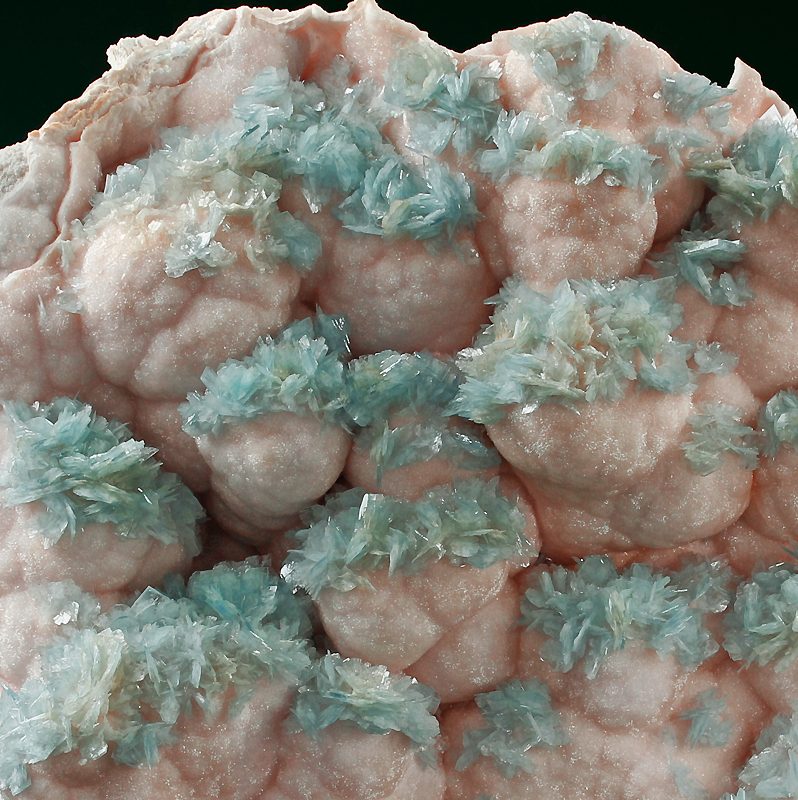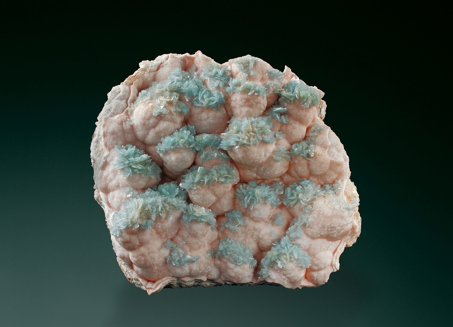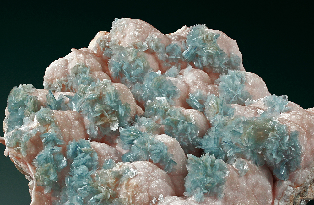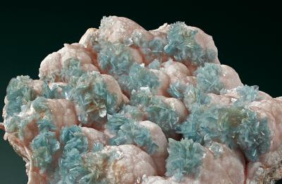 What a superb large cabinet specimen! Sprays of blue barite scattered on a matrix of botryoidal pink dolomite. the piece is very well balanced and in great condition. Stunning quality and gorgeous visual display!