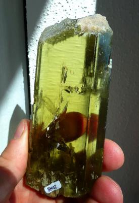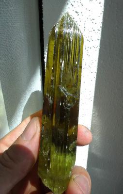 Transparent and deep olive green crystal of spodumen! Unique colour and style from a small find in 2013. The crystal is a total floater and complete on all sides.