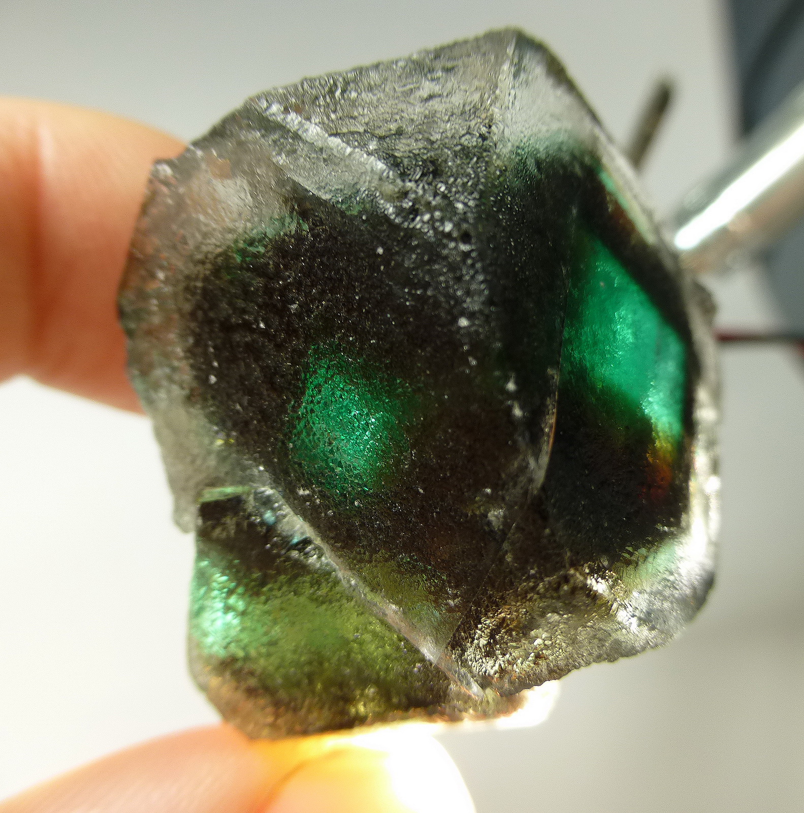 This is a fully etched floater crystal of purple fluorite. the crystal shows beautiful etching patterns on all sides. Note the phantom inside! A new find from 2013. No damage.