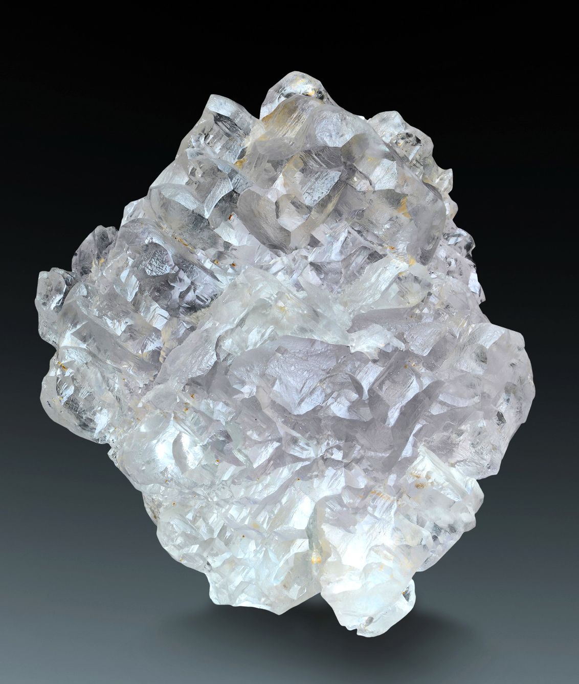 Nicely etched fluorite crystal cluster from Zogno, Italy. The etching produced numerous new faces, rounded corners, hollow forms, all making up for a wonderful 3-dimensional structure on the front and side faces. No damage.