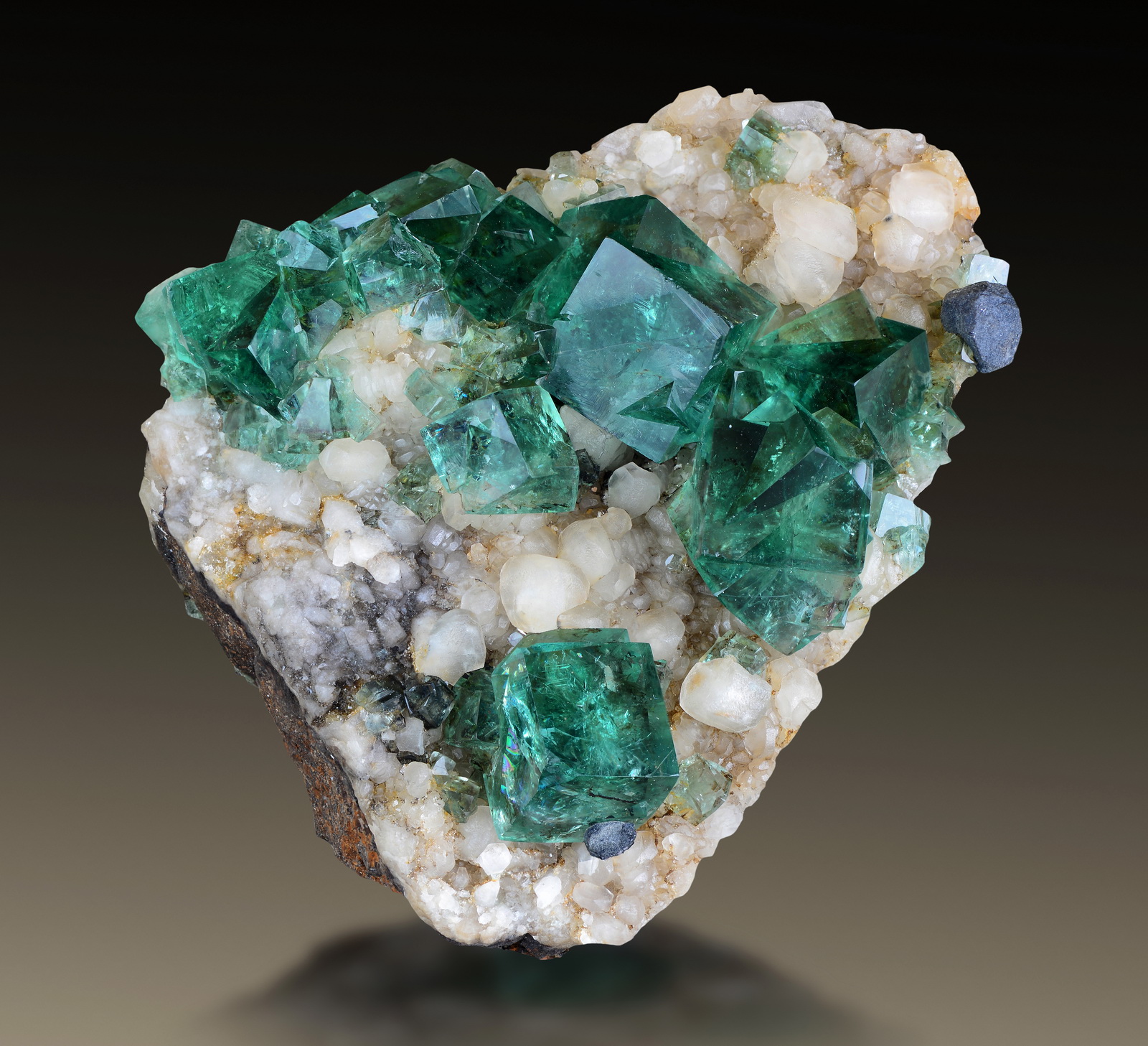 Clear and highly lustrous fluorite cubes on white calcite matrix! All of the crystals are twinned, smal galena crystals set a nice contrast. The specimen is in great condition, just the lower crystal has a slight and insignificant cleave on one corner. A superb specimen featuring isolated fluorite crystals on white calcite matrix!