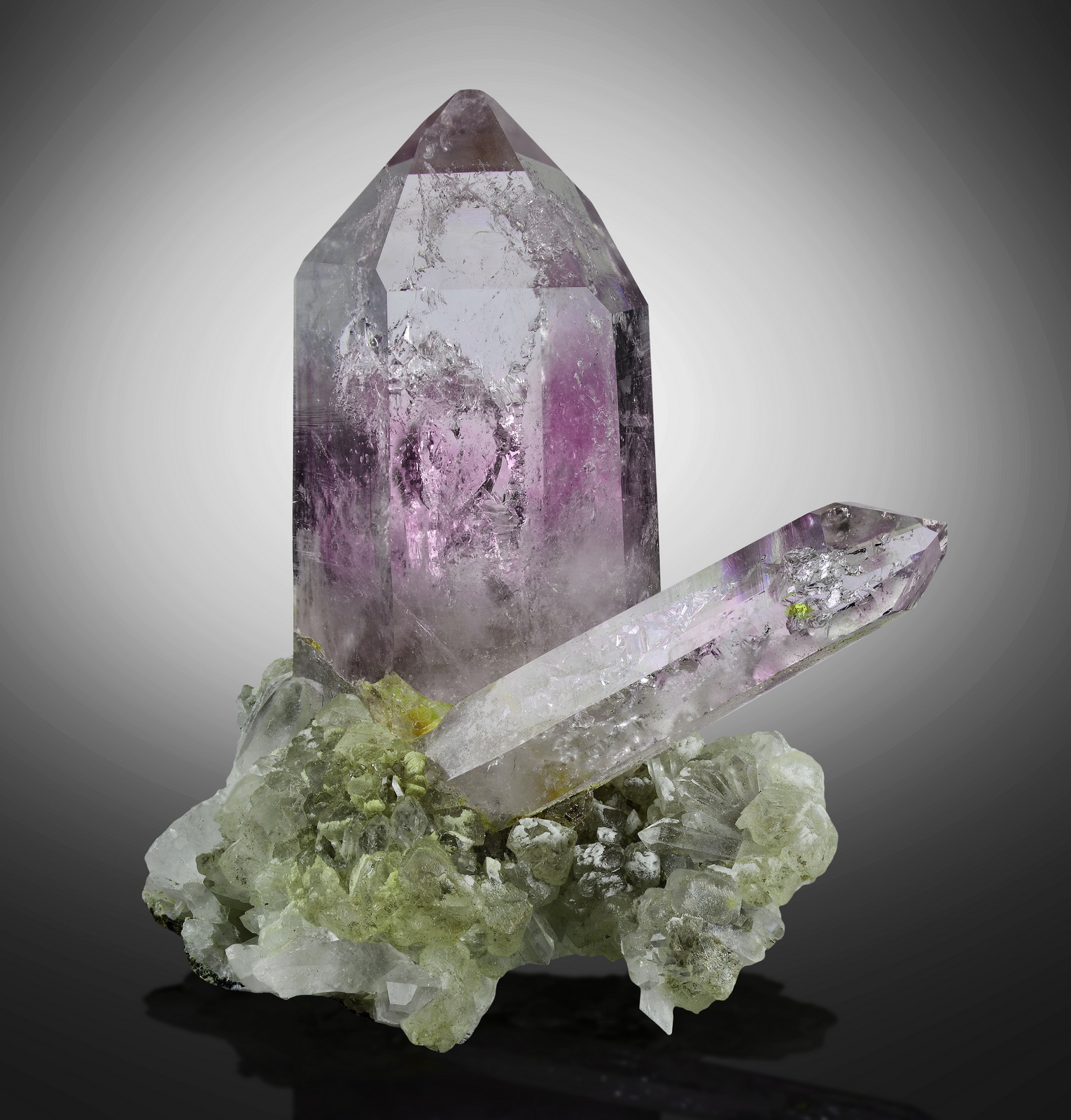 Two rose-coloured amethyst crystals on quartz and calcite matrix! Great aesthetics, perfect all around! No chipping on the terminations.