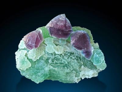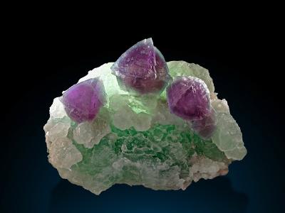 This is a colorful cabinet piece from the first spring-2013 find showing 3 intense purple curving fluorite crystals up to 4cm across perched on a natural pedestal of pastel green fluorite. This is a rich, robust color! A great example of the curved octahedron shape. Contrast, aesthetics and balance are excellent! No damage.