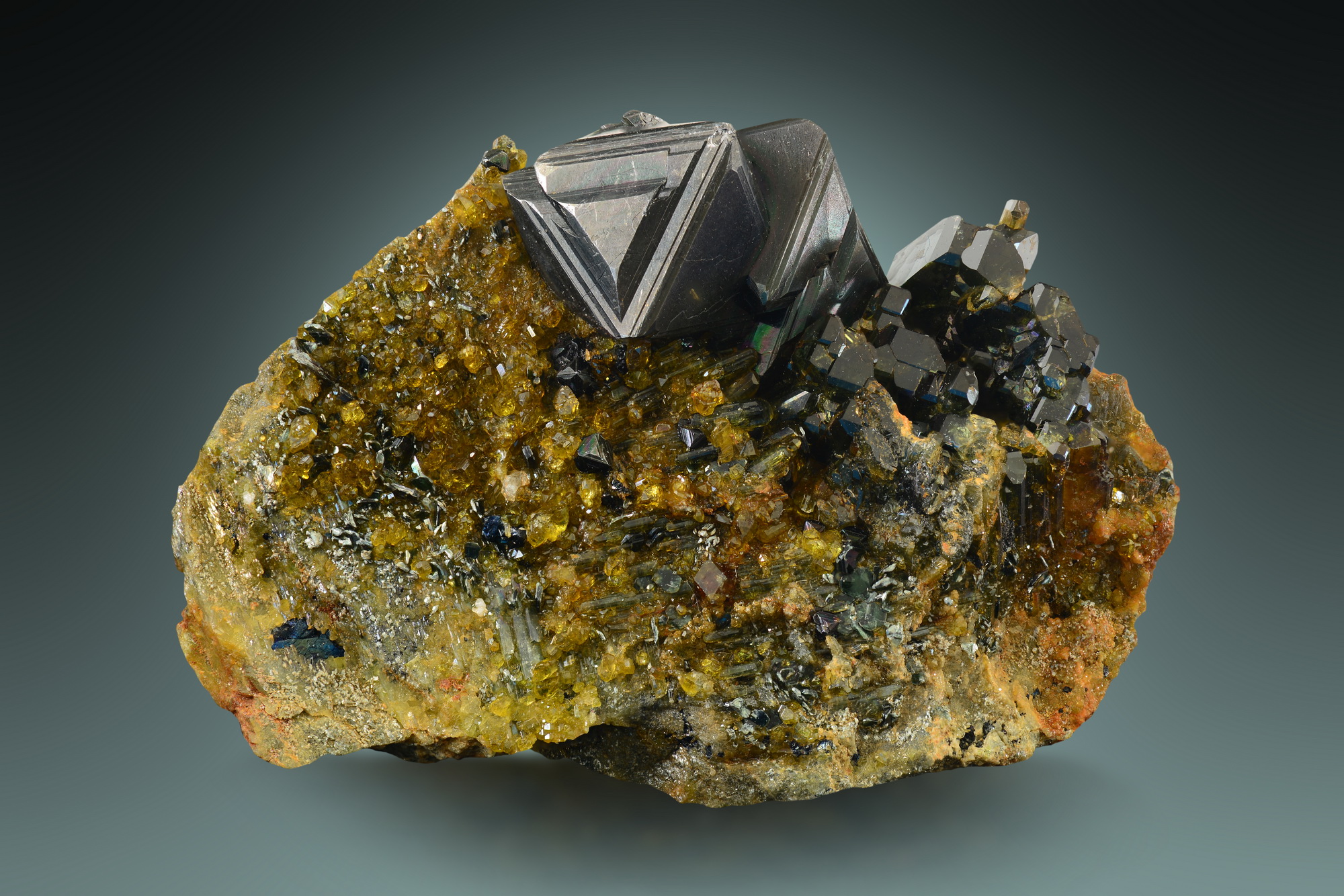 Two magnetite crystals, measuring (together) 16 mm tip to tip, in perfect position on a miniature sized mother rock. Olive green epidotes set a beautiful contrast. Wonderful triangular striations are present on multiple faces.