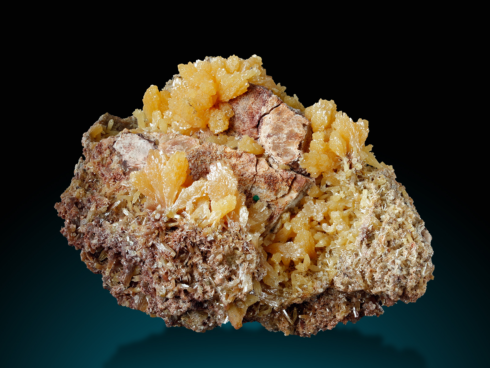 Intense orange-yellow fan-shaped mimetite crystals with sparkling faces on a well balanced matrix, a little green spot of malachite sets a lovely contrast. A really nice sample in excellent quality!
