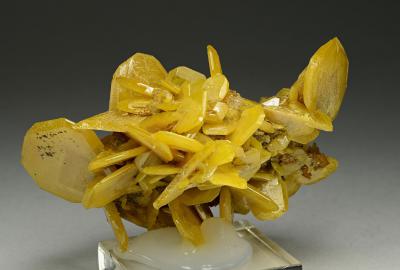 This specimen is a full floater and well crystallized all around. It has two generations of yellow and orange-yellow wulfenite. The composition is very fine, it is very 3-dimensional and there are several well isolated crystals in the cluster. The biggest crystal, the one on the left side, measures 2.5 cm across. The front side is in great condition and there is no damage of any significance. Ex Walter Knobloch specimen.