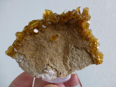 Sparkling yellow barites resting on the opper ridge of a dolomite natrix. The crystals feature great colour and lustre indeed!