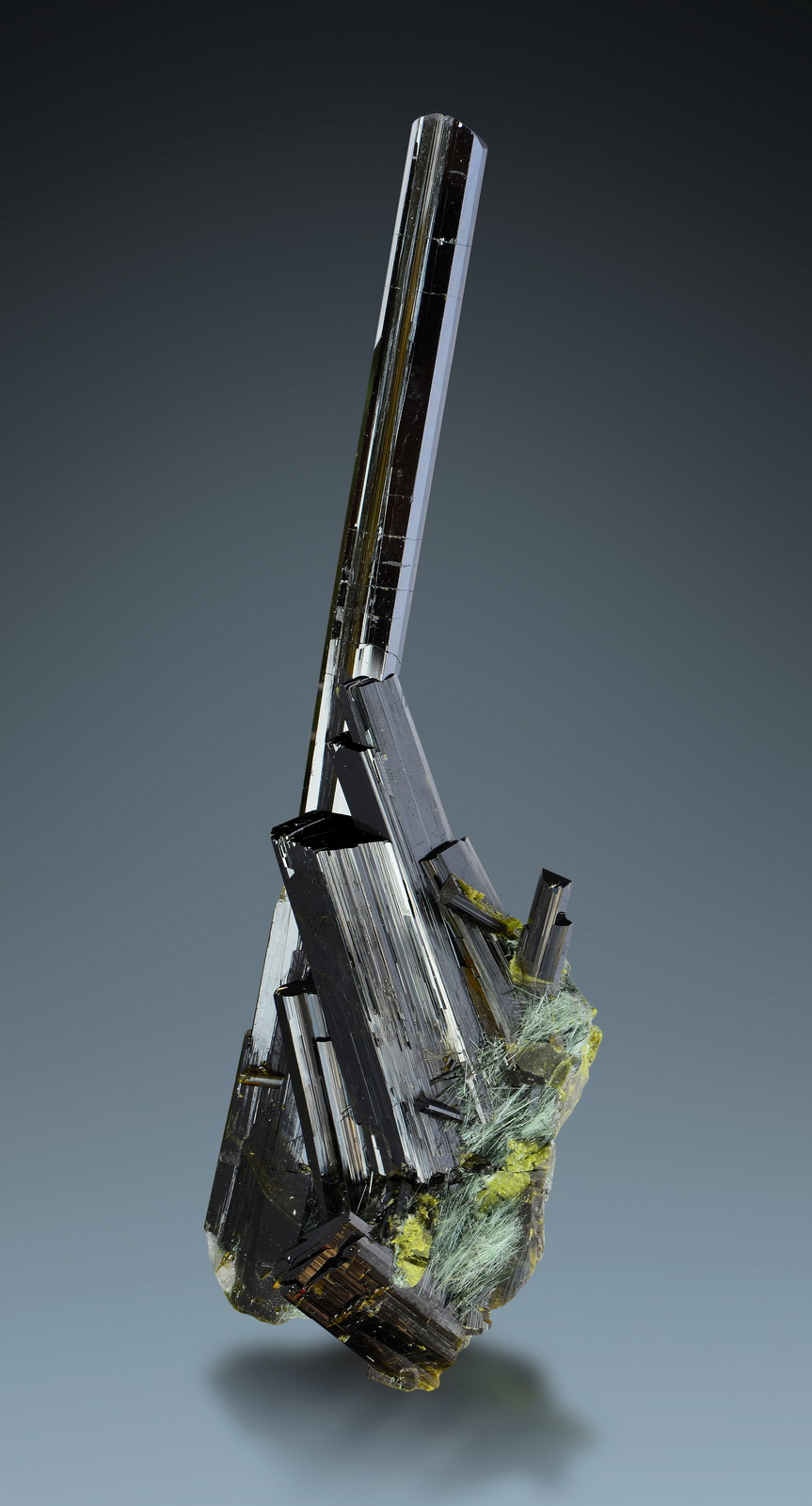 WOW! Whan an awesome epidote rocket, rising up from a cluster group of byssolite and epidote crystals. This is indeed one of the tallest crystals I have ever seen from this famous locality, it measures incredible 17.3 cm from top to bottom! The crystal crossing on the lower right side is thick and sturdy, it measures 2,7 cm in width and features a sharp and brilliant termination. The size is indeed shocking and impressive, and the luster is great all around as well. It is actually bright like a mirror, the best I heve seen from this famous classic locality. This piece comes from one of the last great pockets found in 2008/2009 mining season. The locality has produced nothing even close since then. Unfortunately, the miners are quite sure that the Knappenwand is most likely exploited and production will come to an end soon. This is an excellet opportunity to get one of the best and tallest epidote specimens ever fond at this classic Alpine locality. Repaired 10x, all lock fit, no parts missing though, and no damage on any of the terminations.