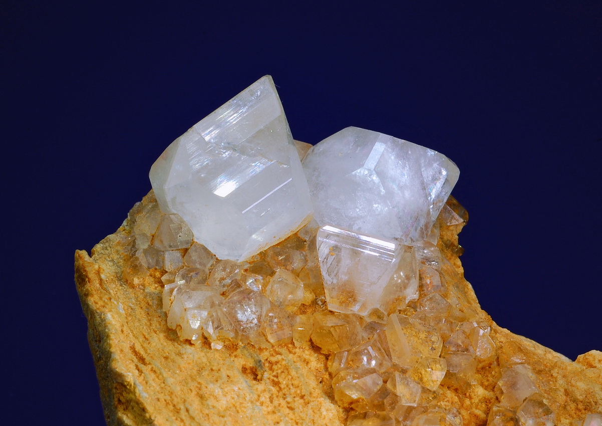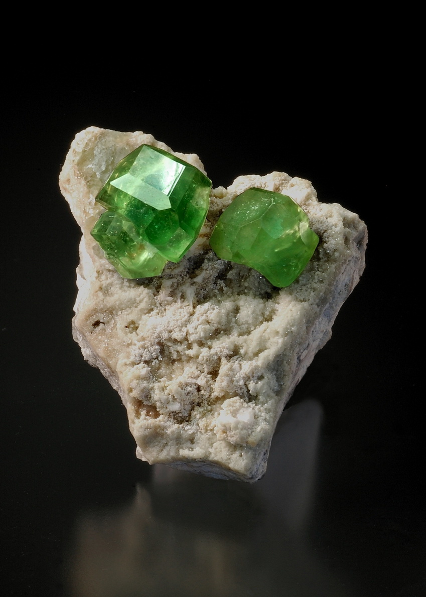 Illustrated in the Mineralogical Record, May-June 2010, page 220. This is a gorgeous killer miniature of exceptionally fine quality! A piece of marble matrix hosts two pristine and sharply edged demantoid crystals. Especially the larger crystal, measuring 14 mm across, has truly superb clarity, luster and colour! One of the very best miniature specimens ever found at the locale!