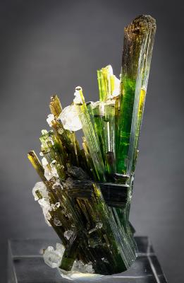 Superb spray of indicolite from Brazil! Doubly-terminated quartz crystals are scattered on and between the tourmaline crystals and provide a beautiful contrast. The pictures show the specimen with back light, revealing both the deep green and yellow colours of the crystals. A few of the small side crystals show little damage, however, this is small and minor in context. The main crystals are in perfect shape and condition.