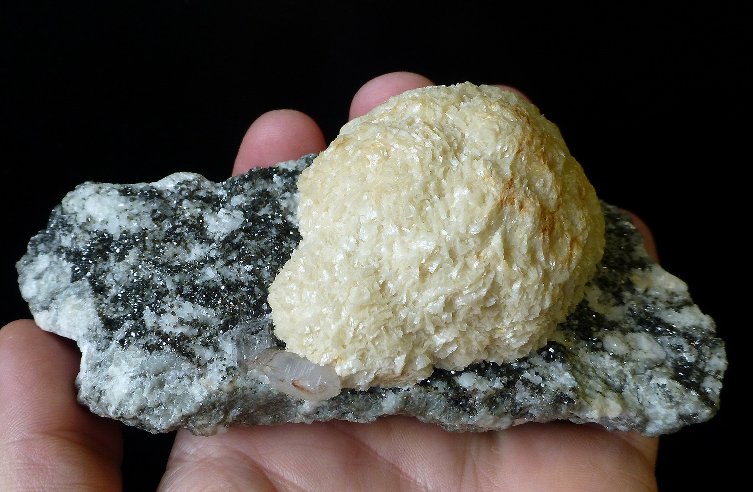 Large ball-shaped aggregate of dolomite on granite matrix. From an old find in "Gaswerkstollen Grimsel". Beautiful arrangement!
