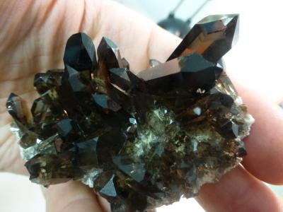 Fantastic quartz crystals featuring exceptionally deep smoky colour on granite matrix. From a very famous find made on Spitzigrat. No damage.