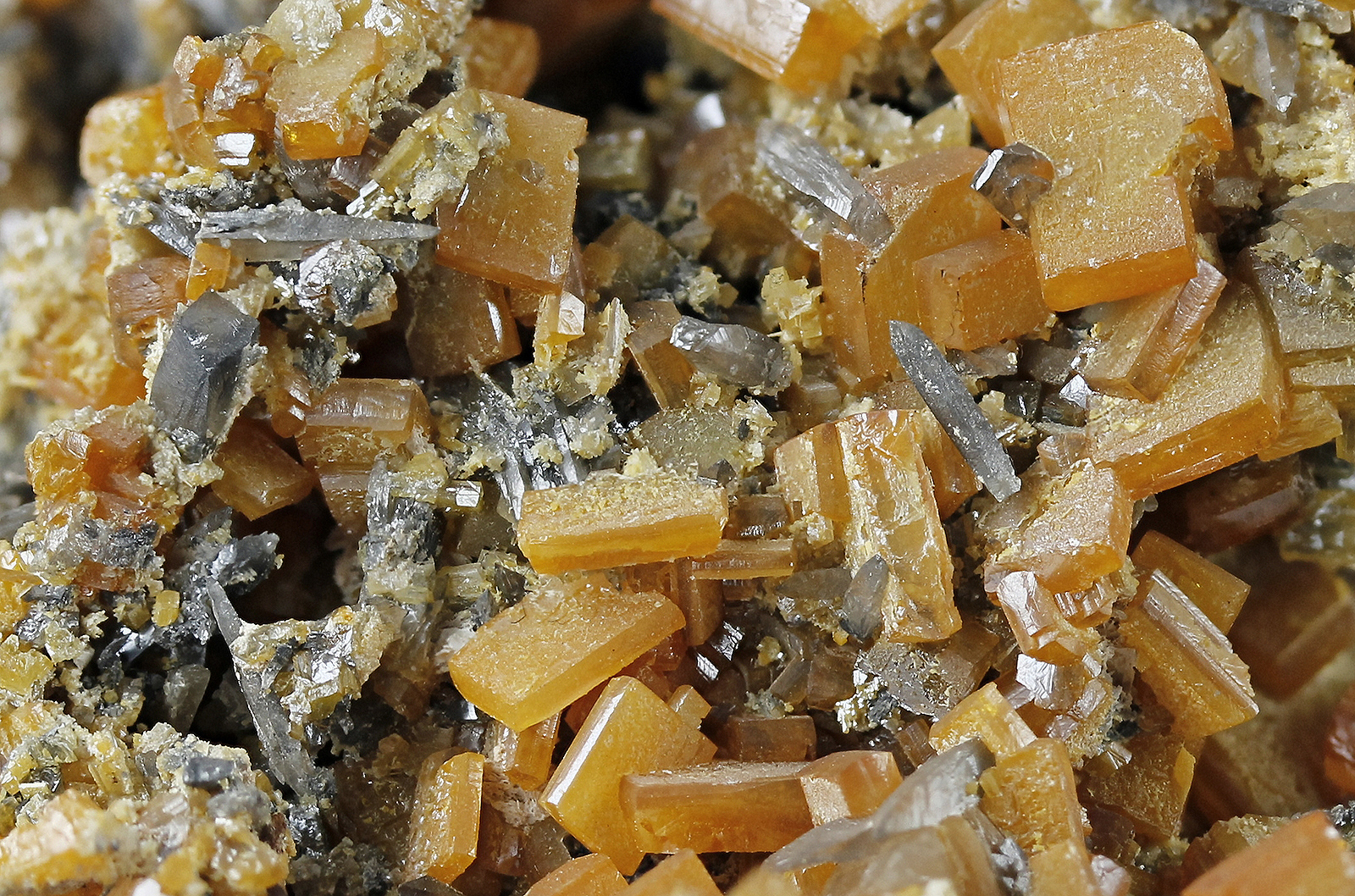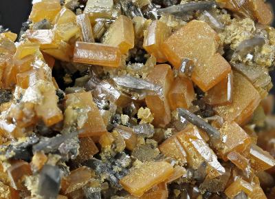 Orange and very rare elongated blue wulfenite crystal in combination.