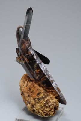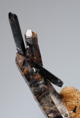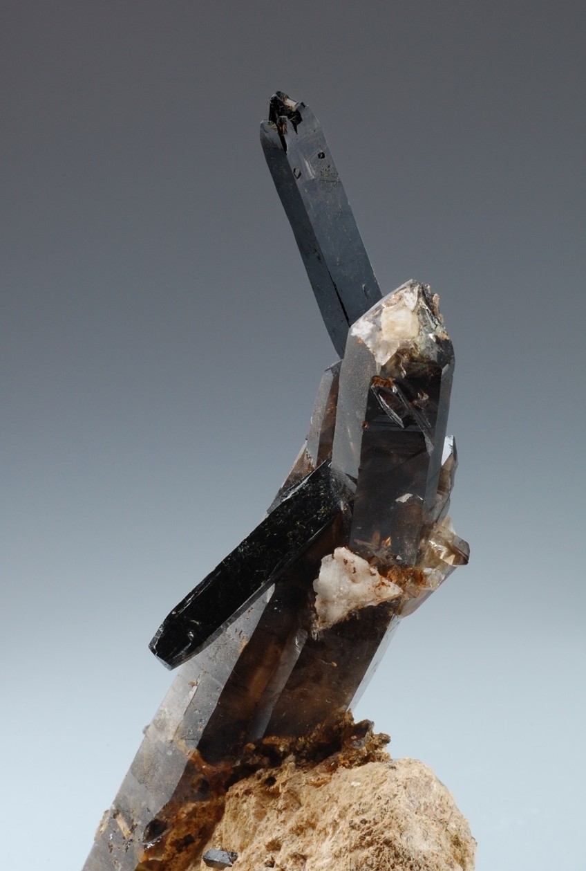 Elongated aegirine crystals on smoky quartz and parisite. Very beautiful specimen of this rare combination!