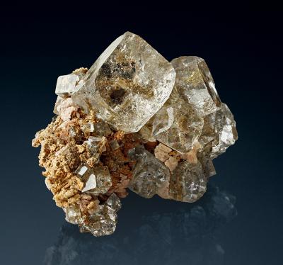 A cube of clear fluorite measuring 2.7 cm on edge perched on matrix. Note the naturally bevelled corners showing multiple faces. This is an excellent sample of the famous "aquarium" style! No damage.