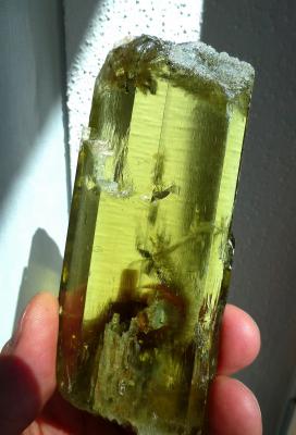 Transparent and deep olive green crystal of spodumen! Unique colour and style from a small find in 2013. The crystal is a total floater and complete on all sides.