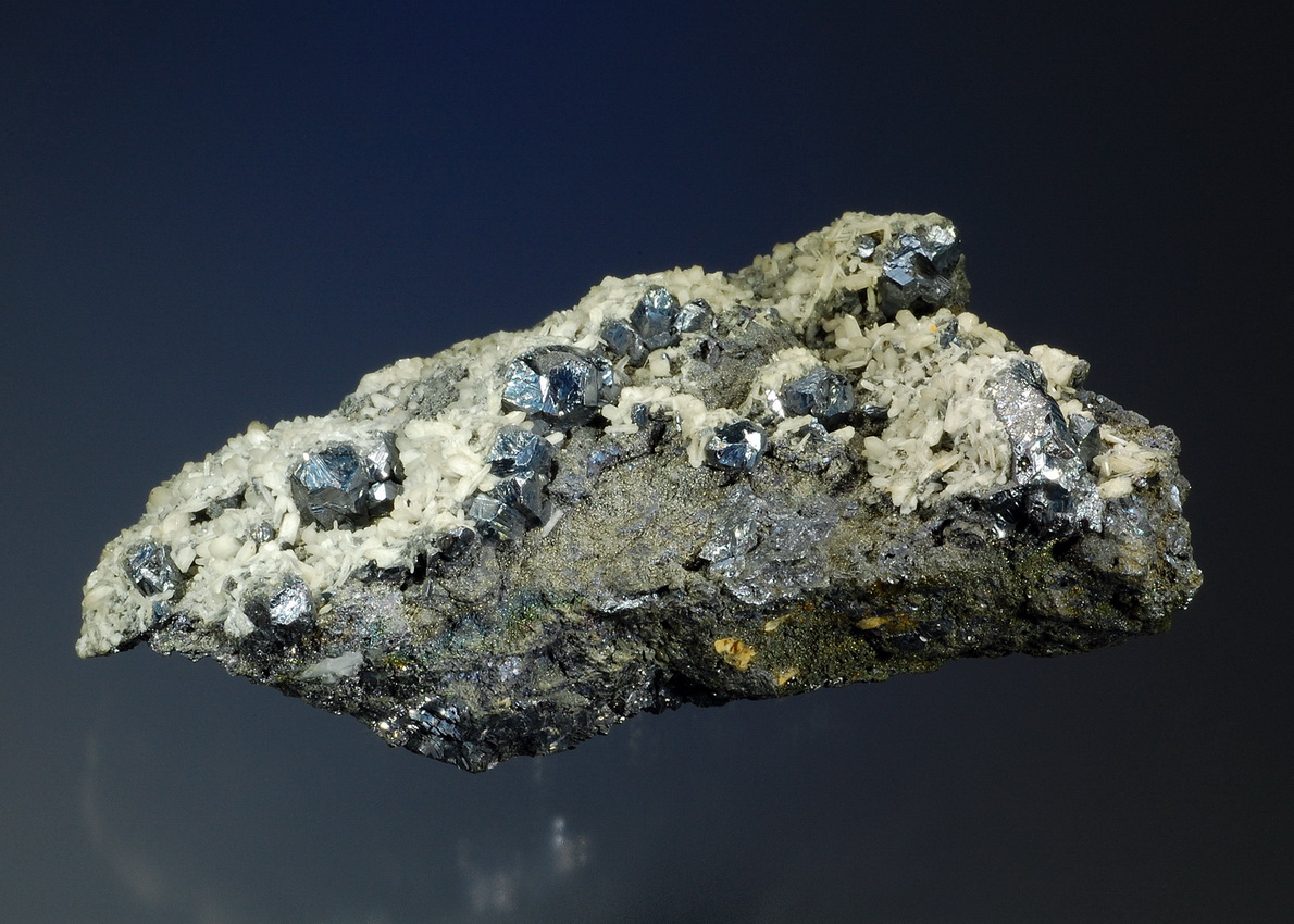 Half a dozen highly lustrous pyrargyrite crystals measuring to 1.6 cm across resting on a matrix of dark galena ore. The top back side of the crystals is nicely covered by bright stilbite crystals! Very nice sample of a rarely seen association!