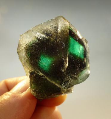 This is a fully etched floater crystal of purple fluorite. the crystal shows beautiful etching patterns on all sides. Note the phantom inside! A new find from 2013. No damage.