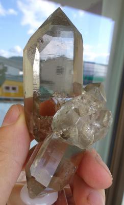 Clear smoky quartz crystals on typical Giuv syenite matrix. No damage.