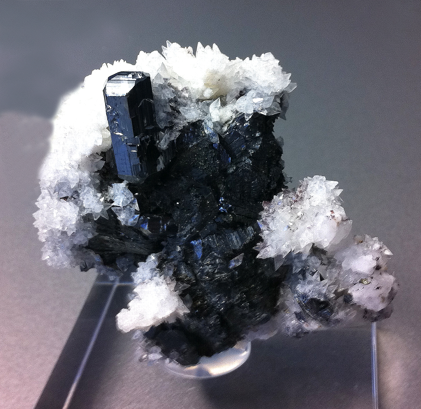 Sharp and lustrous stephanite crystal on calcite matrix. Just awesome!