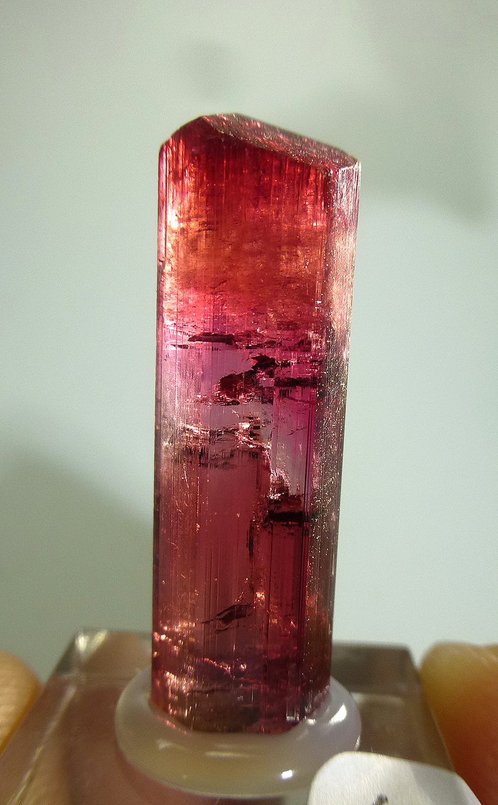 Undamaged rubellite crystal from an old find at Cruzeiro mine. It features nicely changing red and deep pink hues.