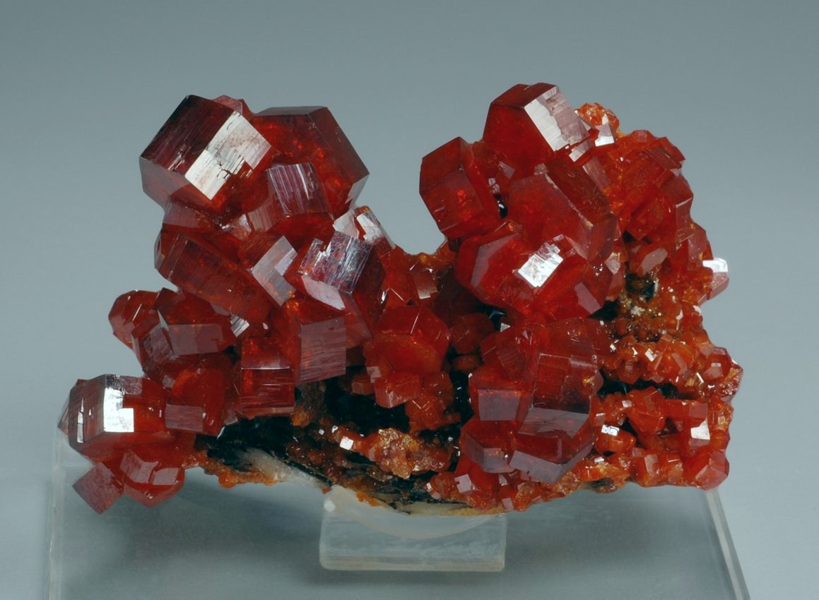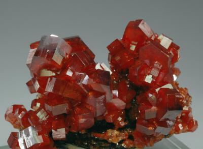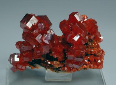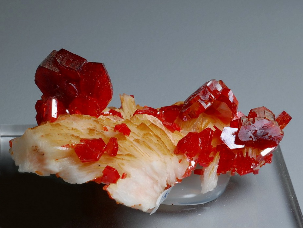 Deep red vanadinites on nicely contrasting baryte crystals.