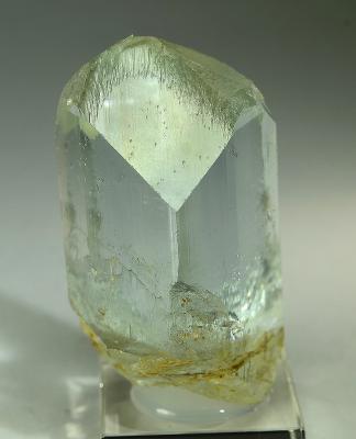 Clear and lustrous topaz crystal featuring special etching patterns twoards the upper termination. The colour is actually a very light blueish tone, the yellow hue in the bottom section results from limonite inclusions.