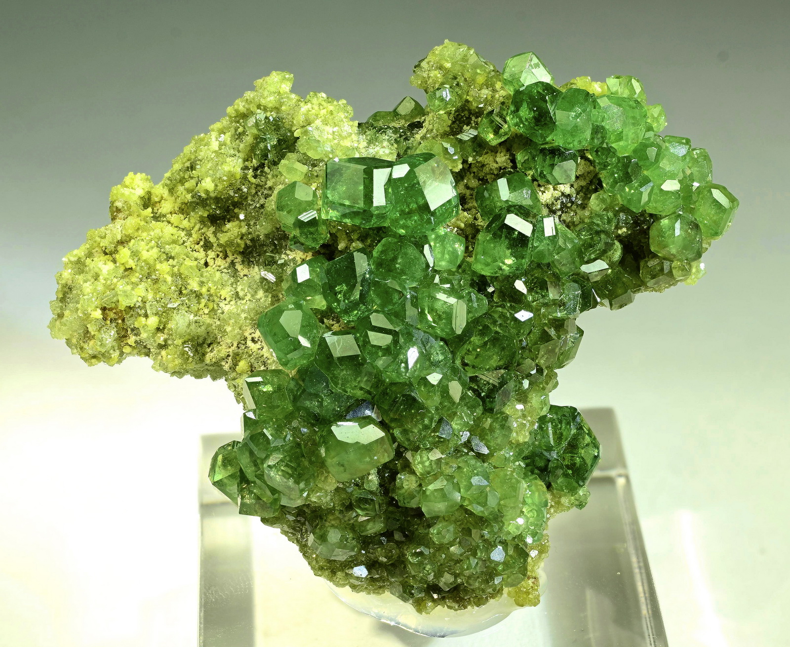Gemmy and lustrous demantoide crystals in a beautiful cluster on matrix. The centre group of two crystals is exceptionally bright, totally clear and also very exposed. Actually it is perched totally freestanding on the smaller crystals below. The sparkle on this specimen is indeed amazing in person, the pictures sadly fail to show the outstanding quality and compsition. Much better in person. No damage.