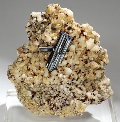 A perfect and highly lustrous, 19 mm long rutile crystal perched on a bed of small pericline and mica crystals! The rutile has incredible striations and great termination faces. What an excellent sample from one of the very best rutile finds ever made in the Alps!