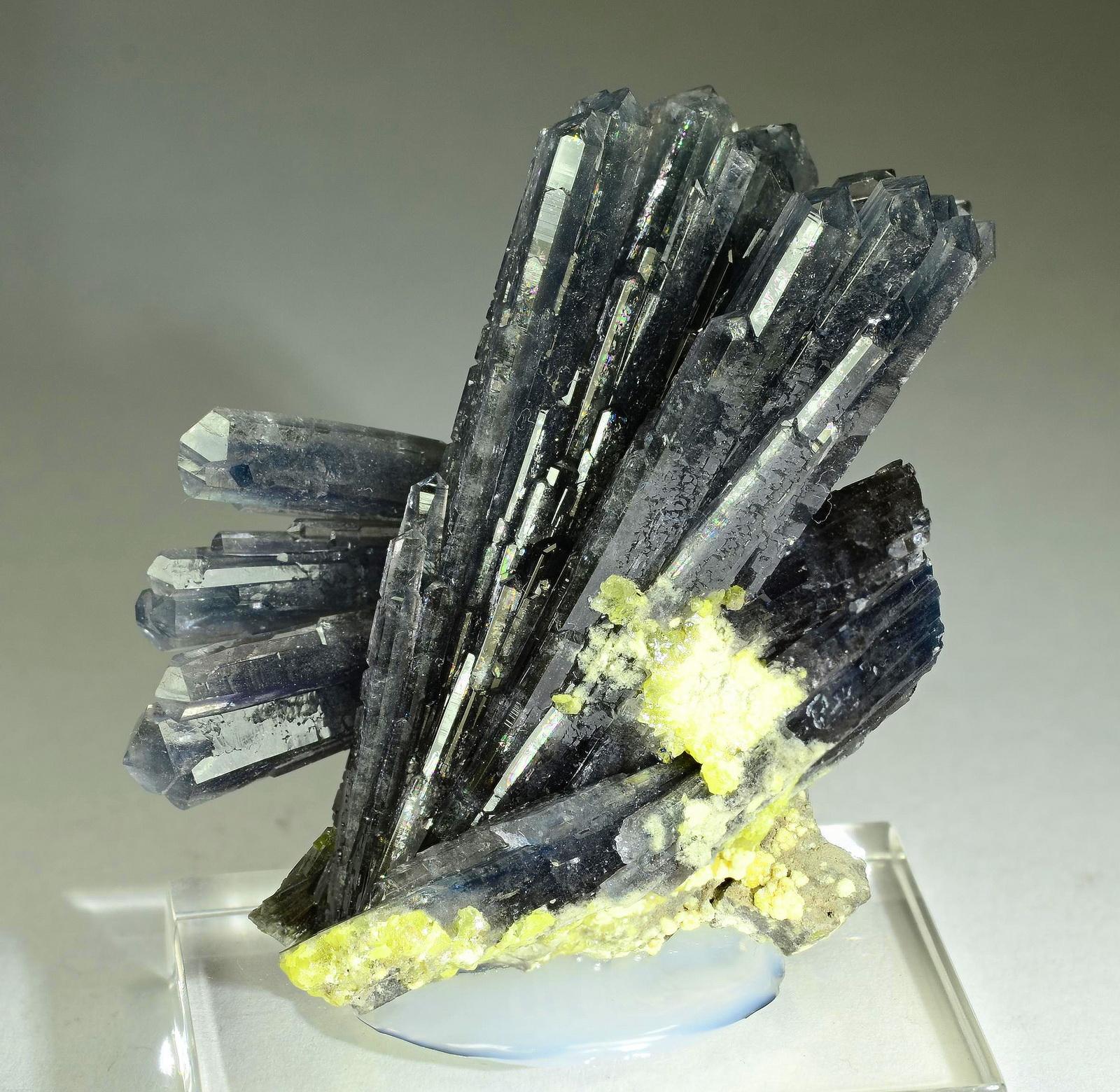 A beautiful spray of irridiated coelestine on sulfur. The terminations are all pristine and undamaged. Great aesthetics!