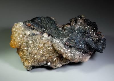 Excellent half-breed in small cabinet size! The silver on this specimen shows very sharp crystals, it is very bright and shiny! The copper has a typical brownish patina and serves as a beautiful matrix for the silver crystals on top. Both species are very well balanced. Eye-candy, and indeed superb quality!