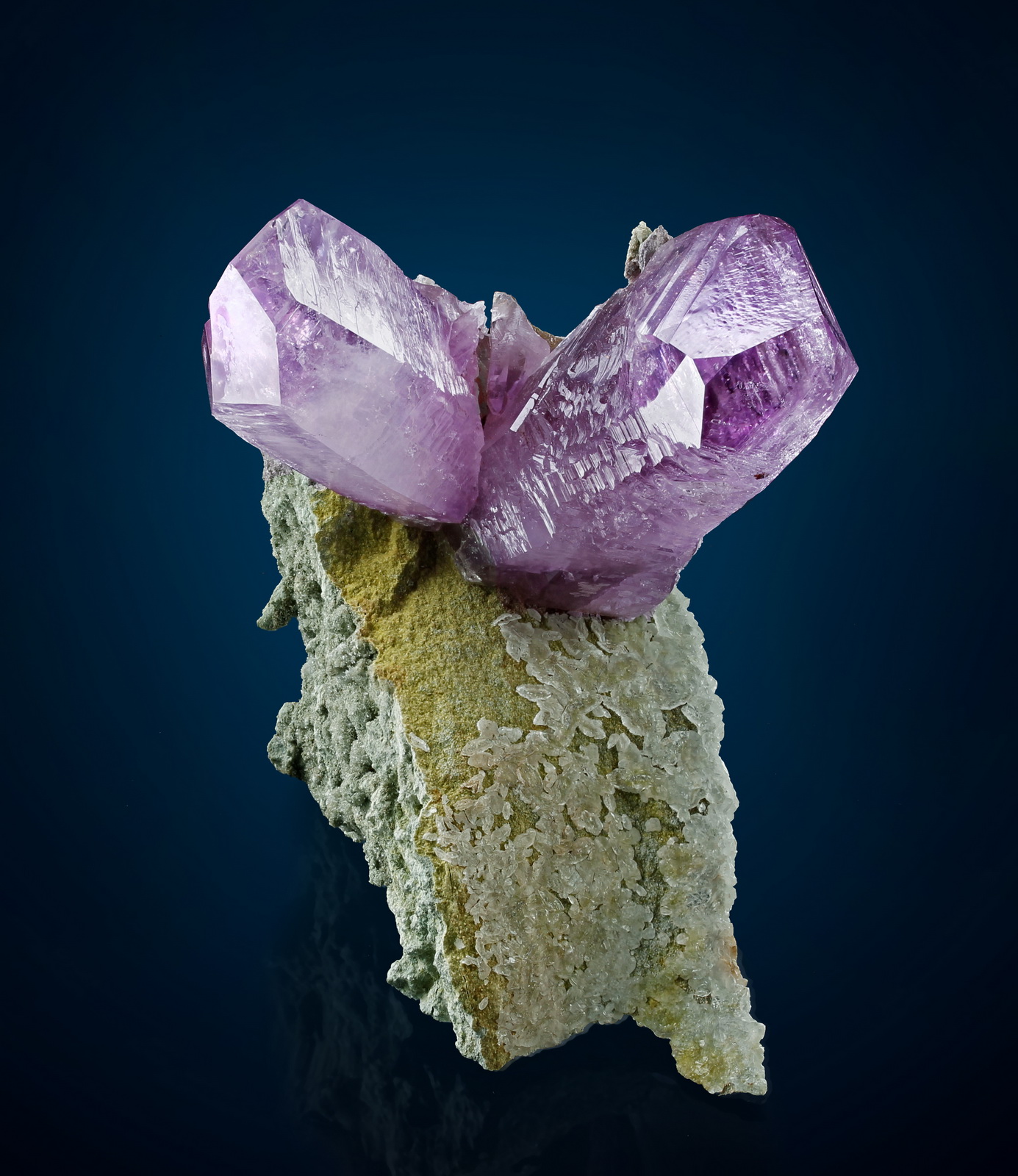 Two brilliant and lustrous amethyst crystals on a matrix covered by micro-crystalline epidote. No damage.