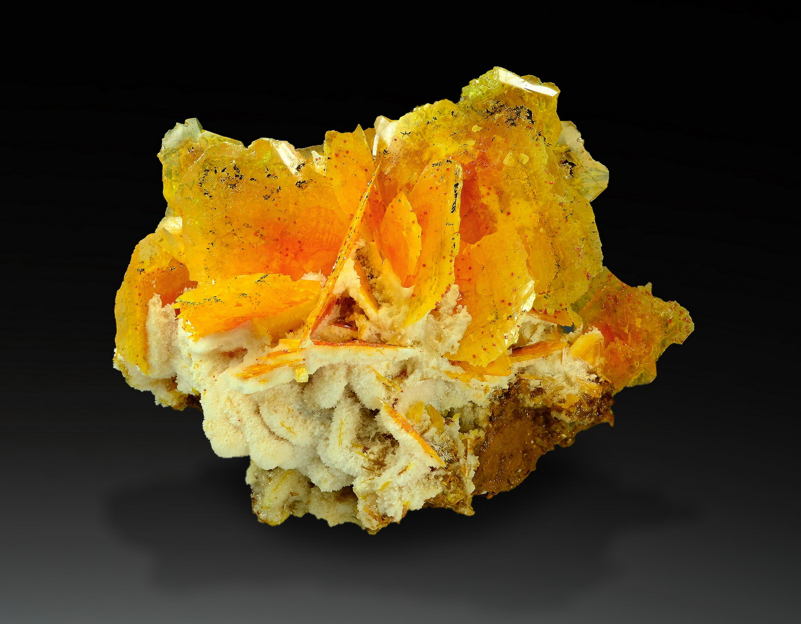 This specimen features the very best colour of the entire find. Deep orange, partially reddish, wulfenite crystals are scattered on a white calcite matrix. Lovely contrast and composition. Minor edge wear is present in places, but it is small and unimportant in context. What a surprise to see this amazing colour coming from new finds from Iran!