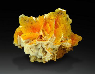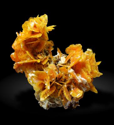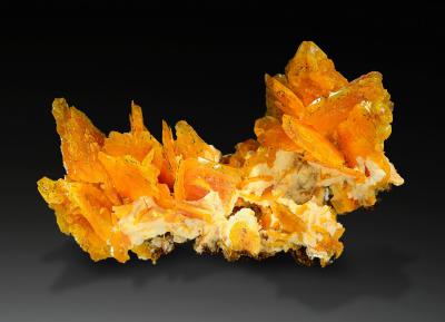 Superb cabinte size cluster of skeletal wulfenite crystals to 29 mm on calcite matrix. The arrangement is very 3-dimensional, and almost all crystals are in perfect condition. In fact, this is one of the finest samples from the deep orange pocket!