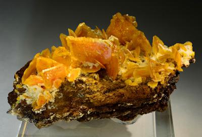 Deep orange wulfenite crystals to 22 mm across on gossan matrix. Note the reddish phantoms inside the crystals, which are probably due to vanadinite inclusions. Excellent specimen, no damage!