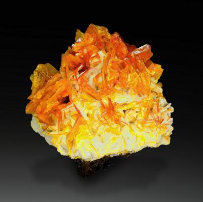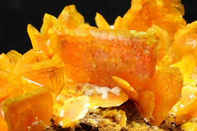 This is a lovely miniature, featuring deep orange colour, nice contrast and great 3-dimensional composition. The special feature of specimens coming from this pocket is a clear zone along the outline of the crystals, whith minor inclusions of plattnerite, and a deep orange crystal core.