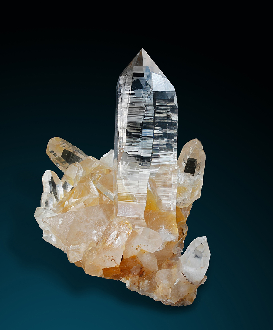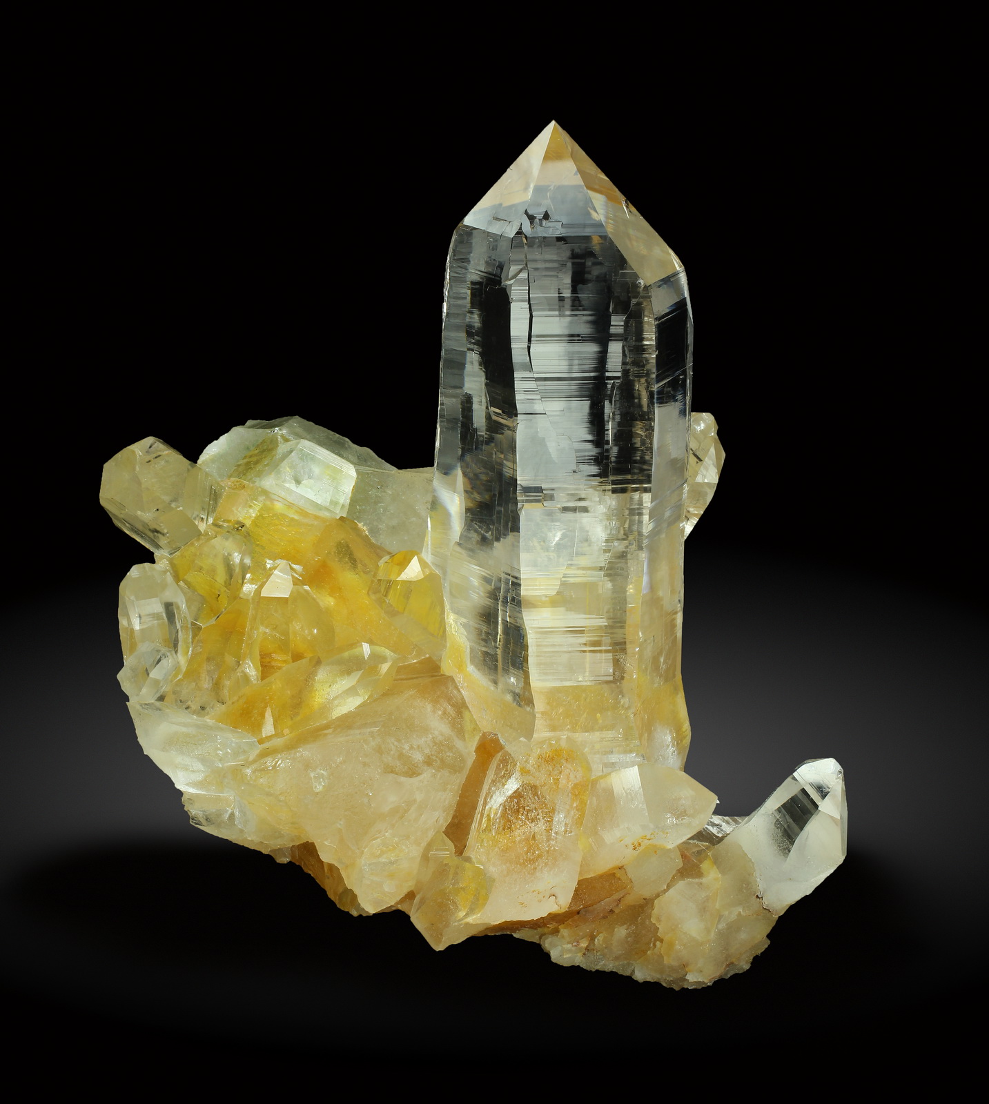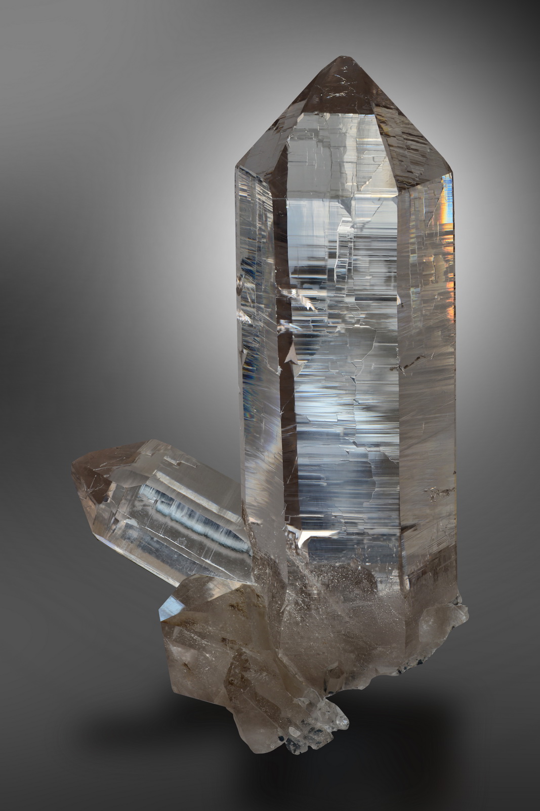Pristine and clear quartz crystal featuring great clarity and a very deep smoky hue.