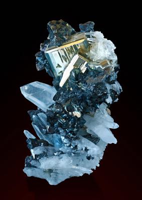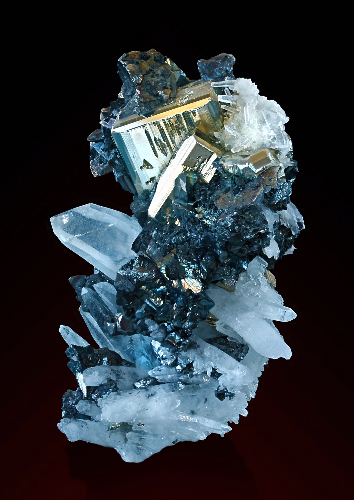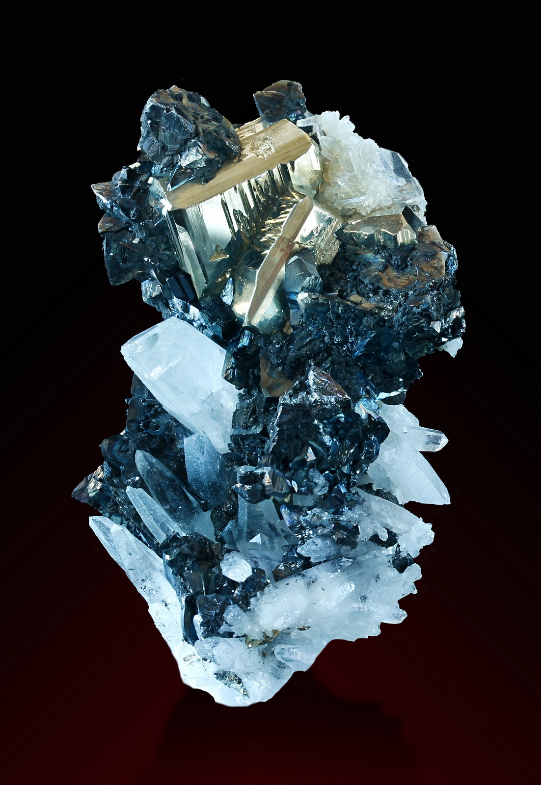 Super brilliant pyrite crystals and sharp tetraedrites perched on quartz crystals! The piece is a floater and very well crystalized all around. Great contrast and shape!
