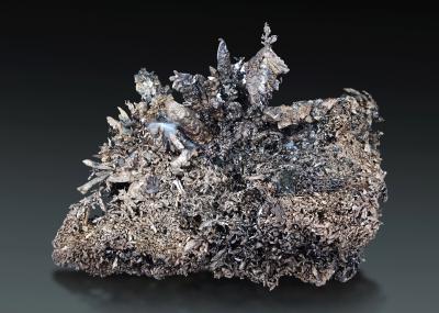 Large and sharp elongated silver crystals standing upright on silver matrix.