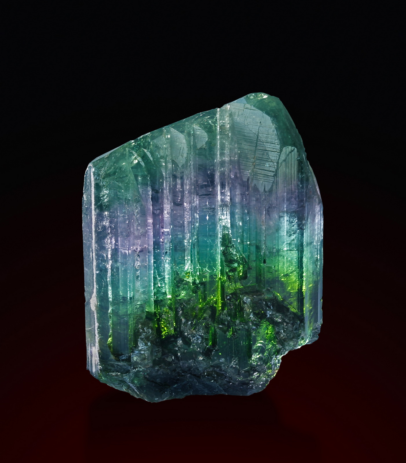 This tourmaline crystal shows a very pleasing lavender/purple zone in between 2 green layers. Great striations on the front side, the termination is also very well formed.