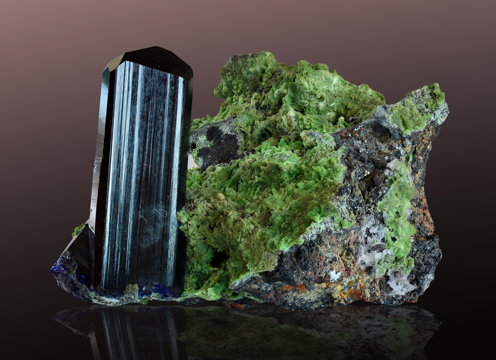 Gorgeous elongated azurite crystal resting on nicely contrasting green bayldonite matrix. The termination of the azurite crystal is sharp and free of damage. Deeply blue when backlight!